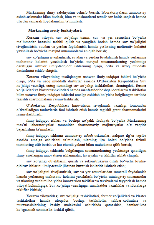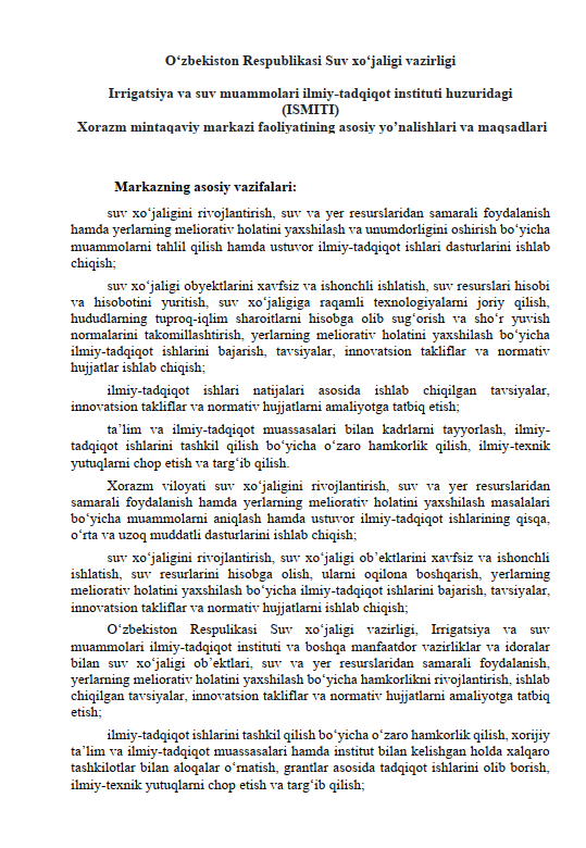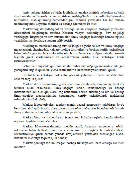 “Suv O‘zbekiston Respublikasining davlat mulki, umummilliy boylik hisoblanadi, suvdan oqilona foydalanish lozim bo'lib, u davlat tomonidan qo'riqlanadi”
